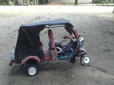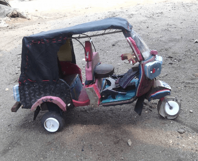 he little boy above constructed a tricycle popularly known as Keke Napep with slippers.